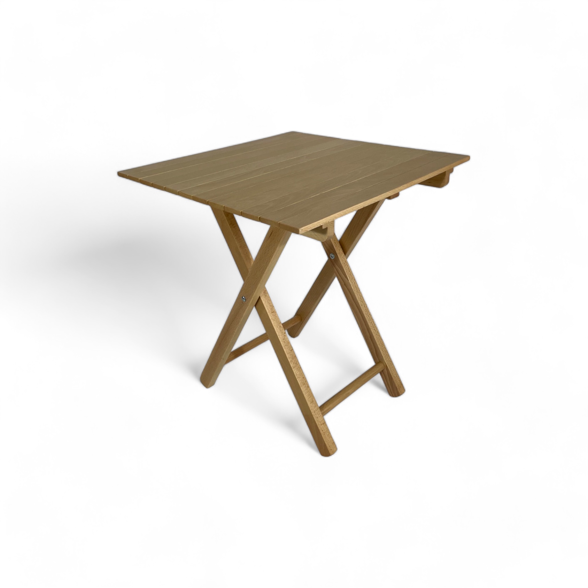 Tavolo pieghevole in legno massello di faggio. Caratterizzato da un piano di appoggio quadrato formato da stecche lineari, separate fra loro da una piccola intercapedine. Gambe incrociate con chiusura a forbice.